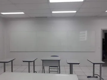 Esta lousa foi projetada para a escola, compondo vidro incolor, mdf e película quadriculada, com perfil U atrás para pendurar a lousa sem ferragens visíveis.