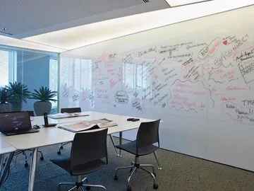 A lousa de vidro colada é sutil, sem ferragens aparentes, próxima à parede, ela é super moderna e torna o ambiente mais contemporâneo.